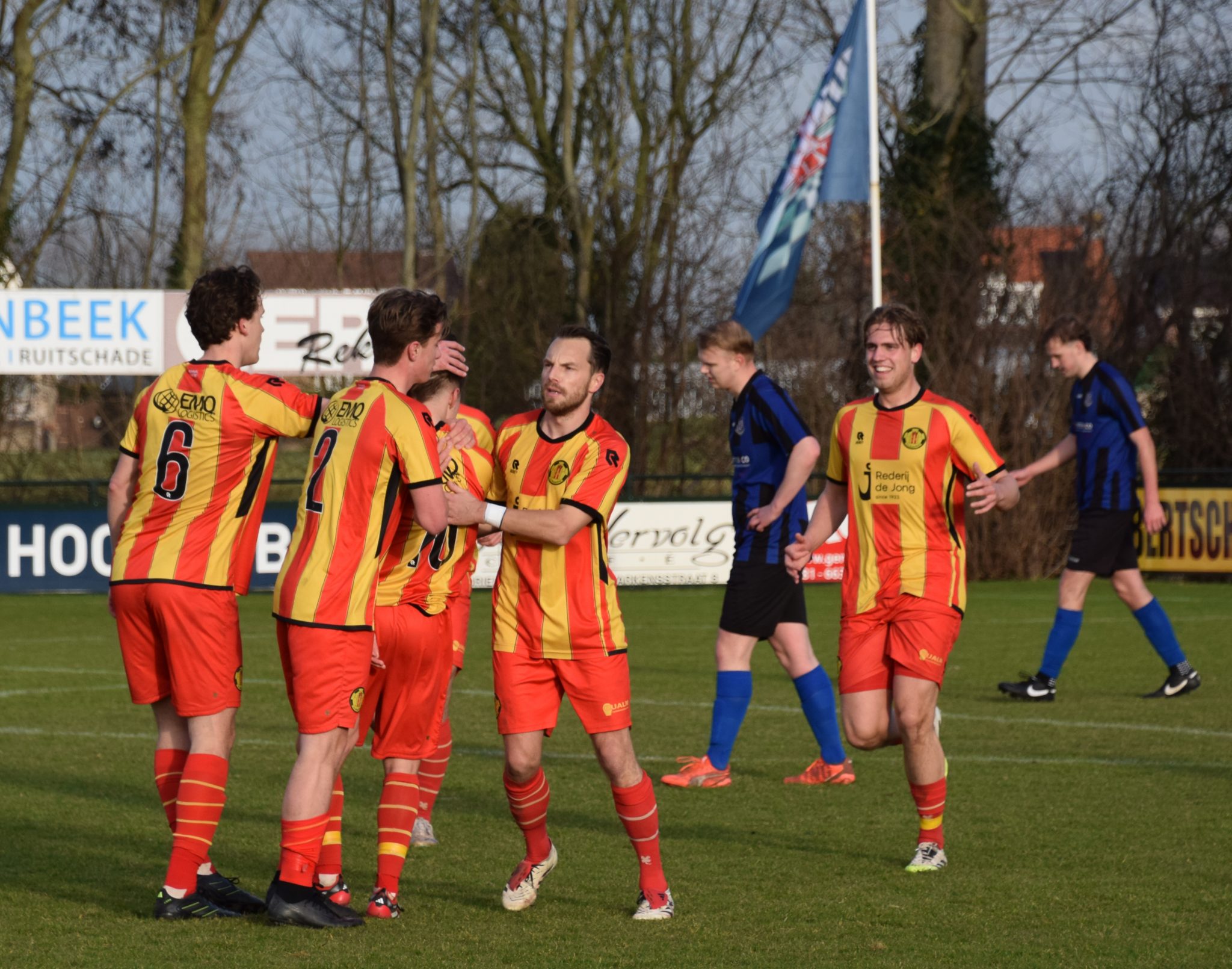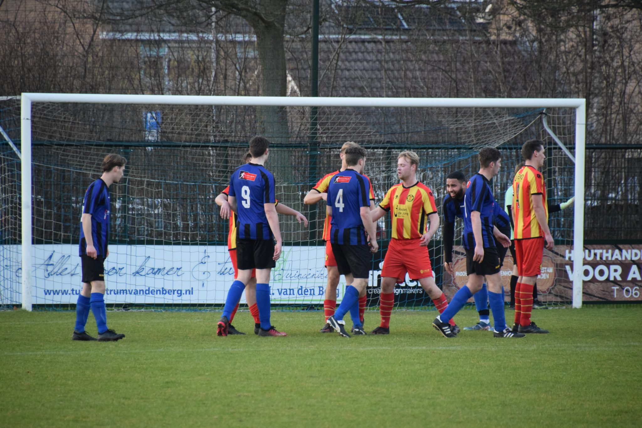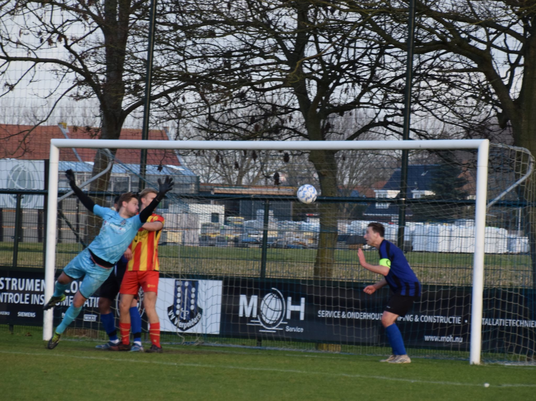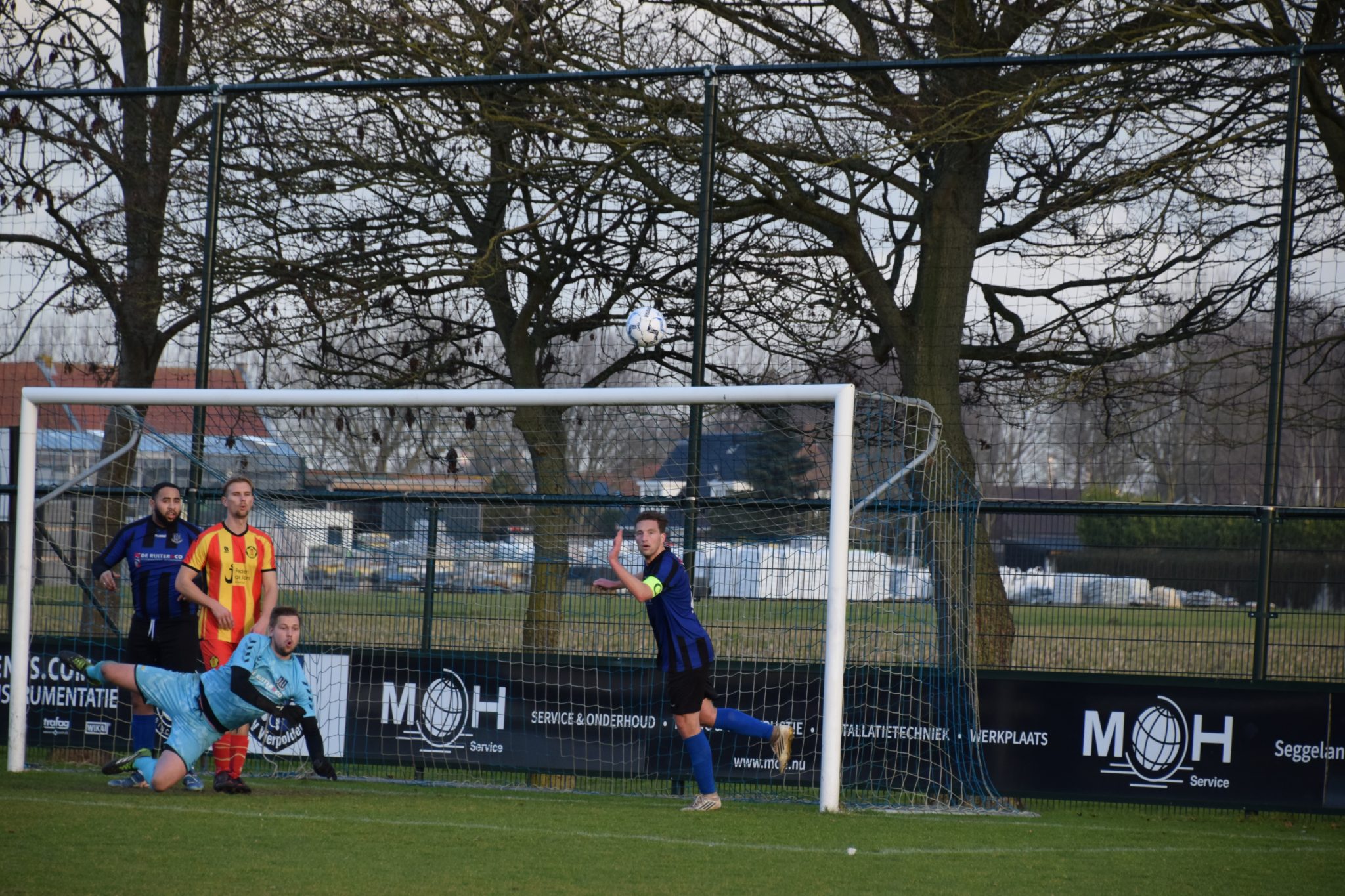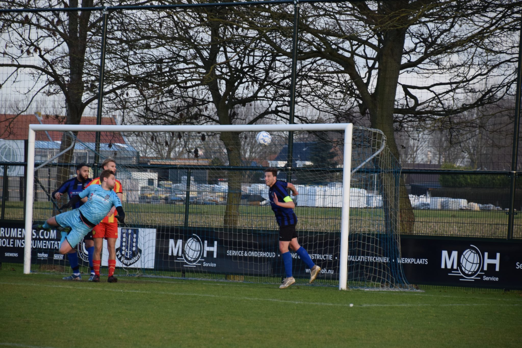 Het overwicht betaalde zich in de 53e minuut uit door een geplaatst schot van een meter of 18 door Damian van de Ridder. Terecht dat hij werd geknuffeld. Er waren mogelijkheden om de score op te voeren. Het viel niet mee in een woud van blauw zwart.