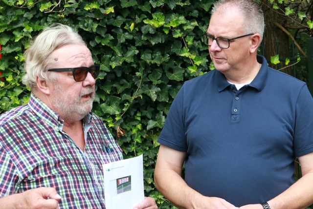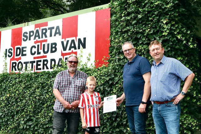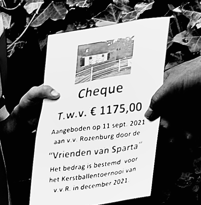 Voorafgaande aan de bekerwedstrijd tegen ESTO overhandigde Arie van Oudheusden een cheque van € 1.175,- aan voorzitter Frank Schellenboom om het Kerstballentoernooi 2021 mogelijk te maken. Hij deed dat samen met Rozenburg-pupil en Sparta-supporter Brian Verheij.