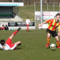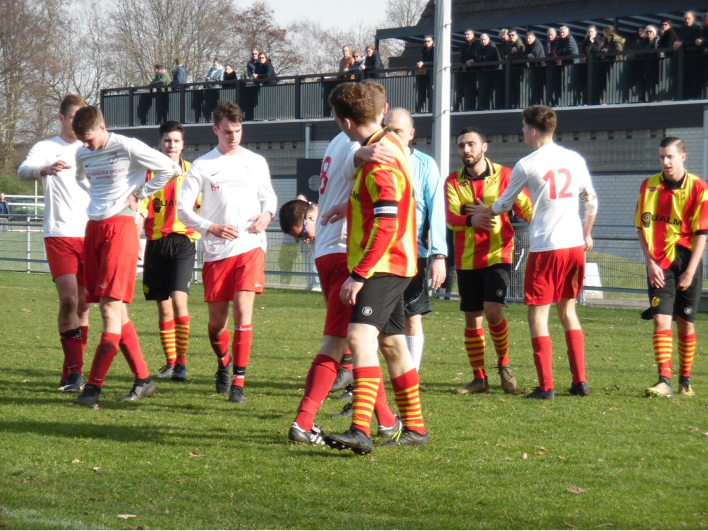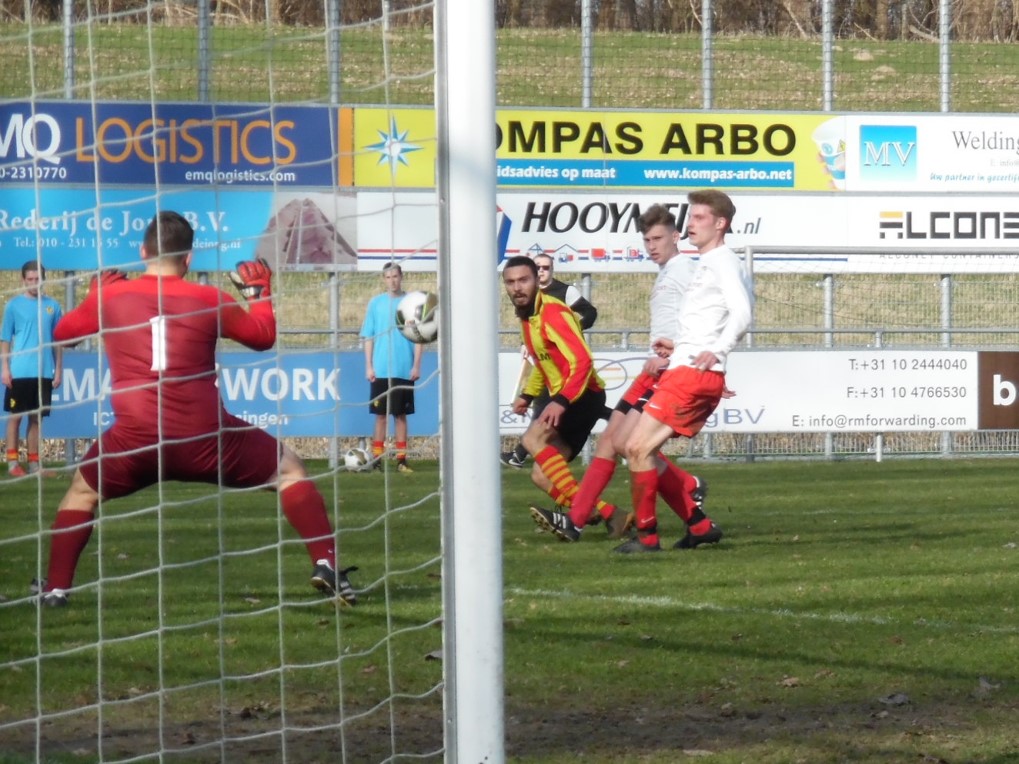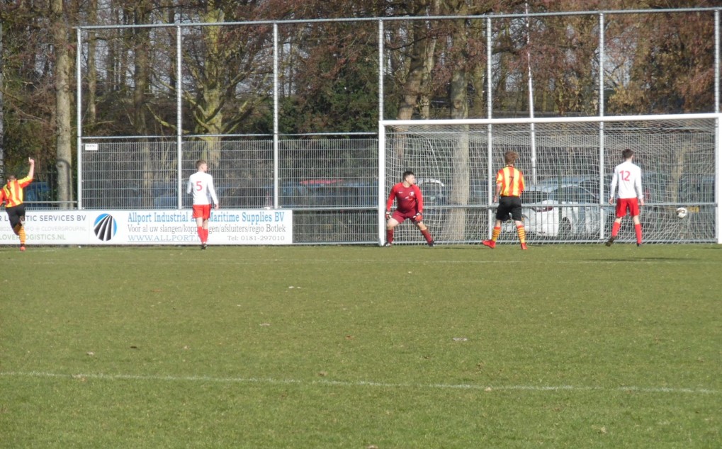 Mooi antwoord op het soms agressieve spel van de gasten. Tot de rust was tempo hoog en kregen beide teams weinig ruimte. Kansjes nog wel van Ronald(net over) en Davey(roller net naast de paal).