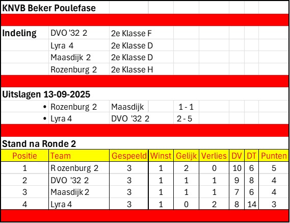 Om de volgende ronde te halen was de inzet tegen Maasdijk winnen. Uiteindelijk bleek het 1 - 1 gelijke spel voldoende om met 1 punt meer poule winnaar te worden en de volgende bekerstrijd op 18 oktober aan te gaan. de nieuwe tegenstander is nog een ?.