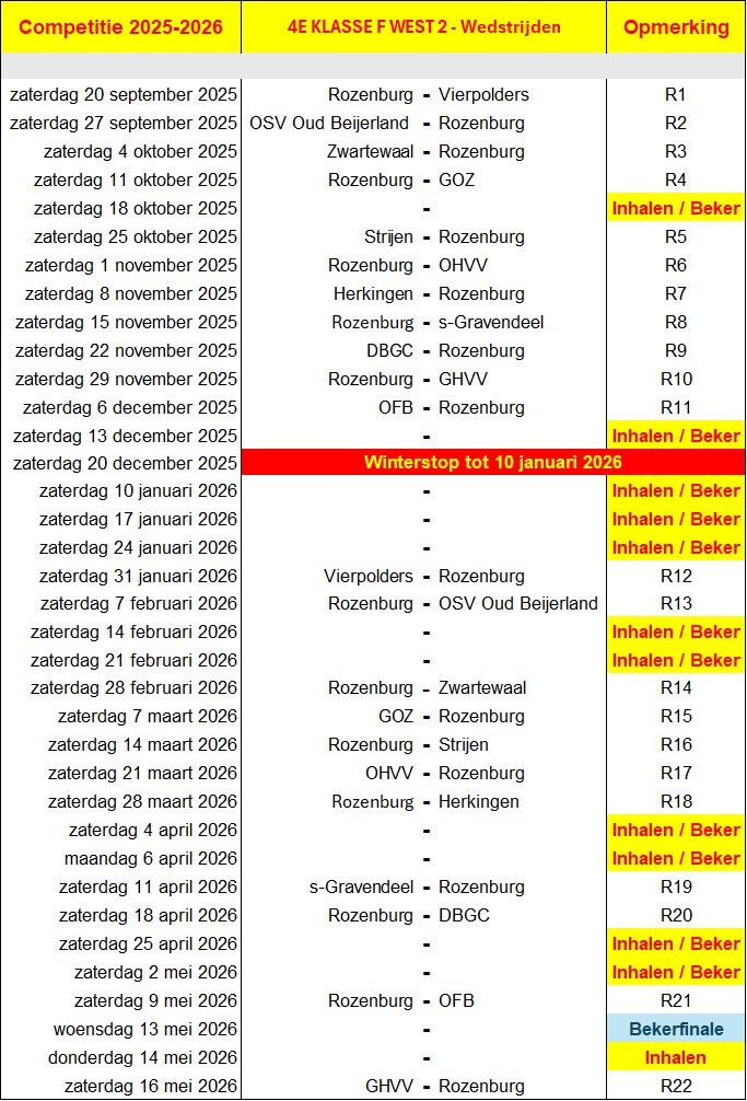 Rozenburg 2 en Rozenburg 1 spelen hun thuiswedstrijden op dezelfde zaterdag respectievelijk om 12:00 en 14:30 uur.