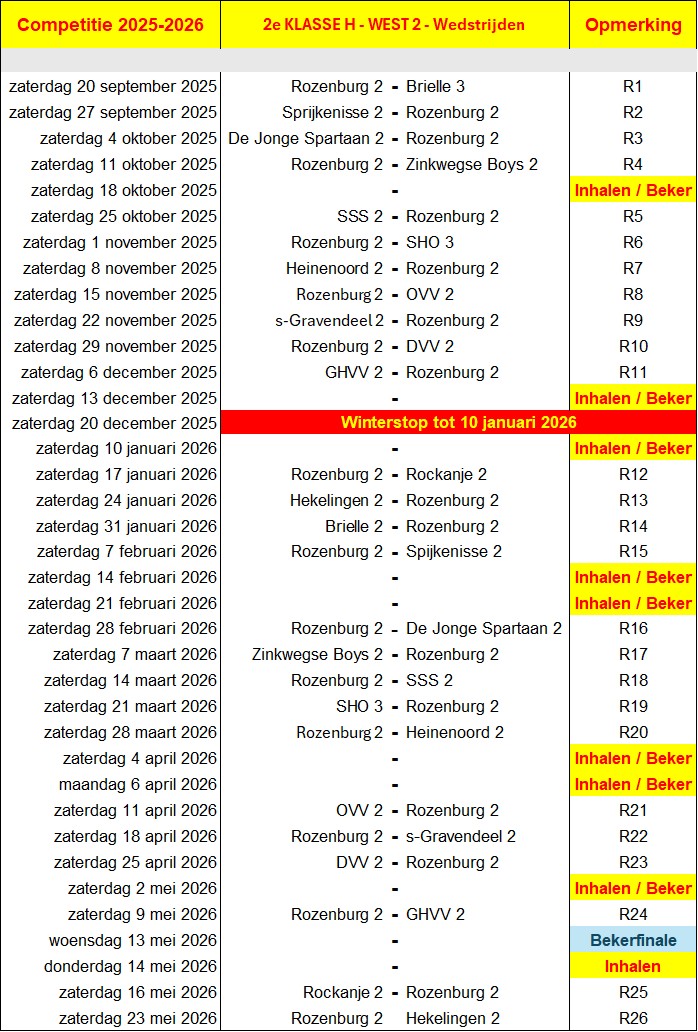 Het tweede elftal van Rozenburg wist zich knap te handhaven in de 2e Klasse H. Dit nieuwe seizoen treft de ploeg geen oude bekenden maar de nieuwelingen Brielle 3, DVV ’09-2, GHVV ’13-2, Heinenoord 2, v.v. Hekelingen 2, De Jonge Spartaan 2, OVV 2, Rockanje 2, SHO 3, SSS 2, Spijkenisse 2 en Zinkwegse Boys 2.
